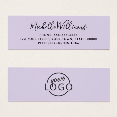 Modern, light purple or any color mini business cards with your custom logo, name, title/company name and contact information. Change colors and fonts, move and resize elements with the design tool
