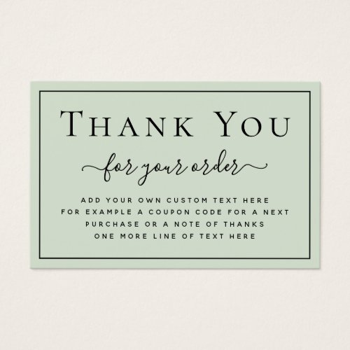 Elegant, light sage green thank you for your order or business insert card with custom logo template and thin, black (or any color) border. You can change fonts and colors with the design tool.