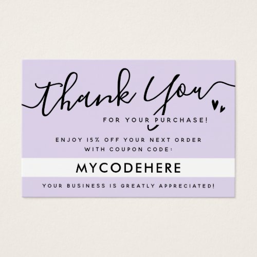 Elegant, light purple thank you for your purchase or business insert card with custom logo and coupon code template. You can change fonts and colors with the design tool.