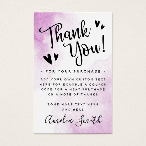Elegant thank you for your purchase or business insert card with custom logo template and light lavender purple watercolor background. You can change fonts and font colors, move and resize elements with the design tool.