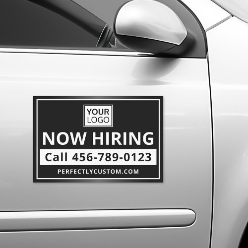 Now hiring customizable car magnet for promoting your business or service. Add your own logo and customise the template text. All colors except the dark gray gradient border are customizable and you can change fonts, move and resize elements with the design tool.