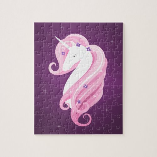Jigsaw puzzle featuring an illustration of a unicorn with pink mane and flowers on a purple background