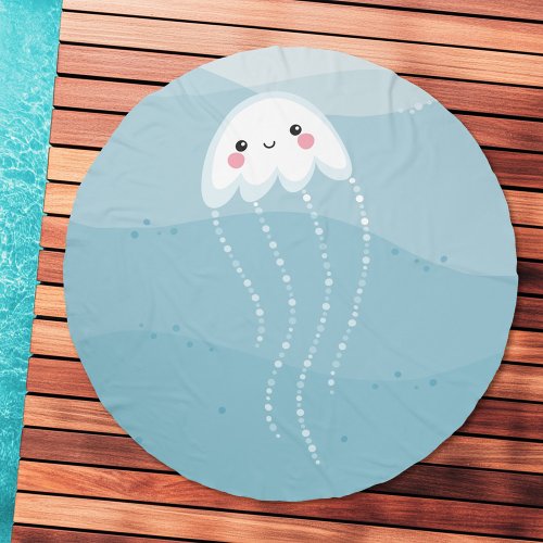 Round beach towel featuring a cartoon illustration of a little cute jellyfish swimming in the sea.