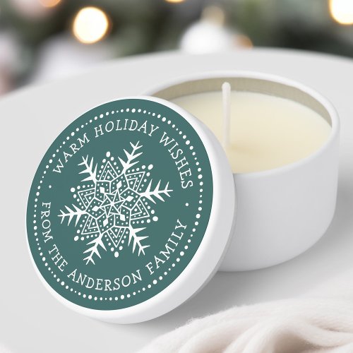 Candles featuring a white, whimsical folk art snowflake and Customizable text “warm holiday wishes” on a pine green background.