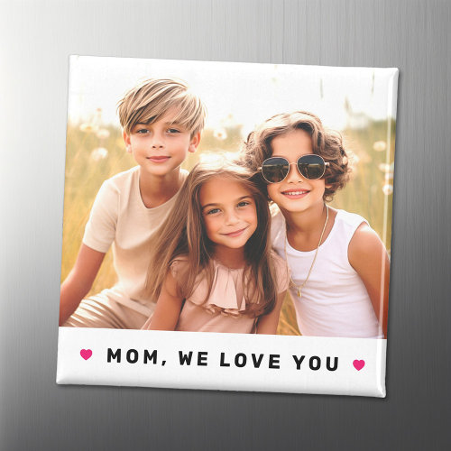 Magnet featuring your custom photo and the text “Mom, we love you” below flanked by hot pink hearts.