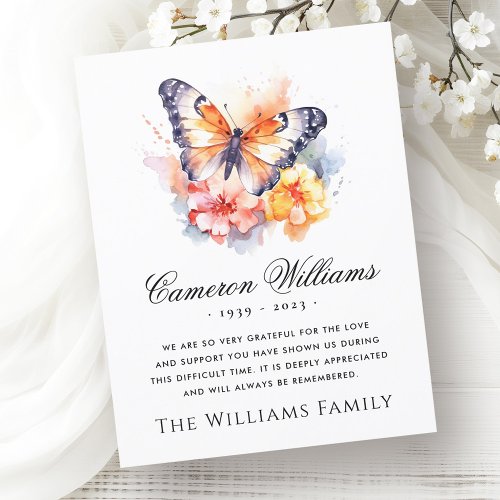 Elegant bereavement sympathy thank you card featuring a watercolor illustration of a butterfly and flowers. Below is a customizable name and year, along with a custom thank you message. White or custom color back.