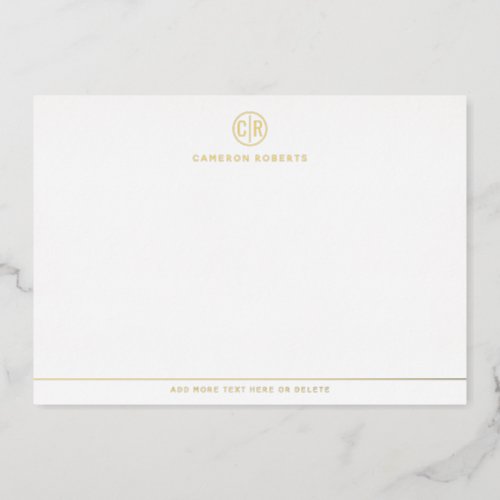 Modern, minimal, white or custom color note cards with your name, monogram initials and custom text. Optional silver, gold or rose gold foil. Change fonts and colors with the design tool.