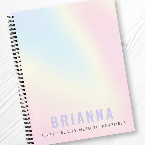 Modern, trendy, notebook with a pastel rainbow pattern and your name in light purple.