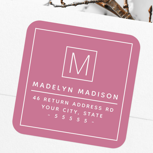 Modern monogram minimal rose mauve return address square sticker