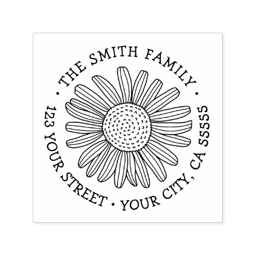 Return address rubber stamp featuring a drawing of a daisy and your name and address around the flower in a whimsical style font.