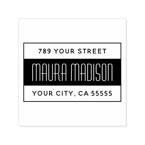 Return address rubber stamp with your name in a modern, trendy font with the address above and below.